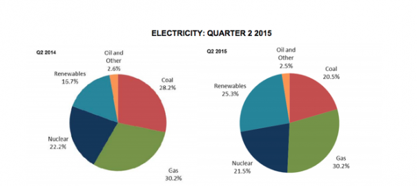 What’s becoming increasingly clear, however, as countries integrate more renewable energy into their grids, is that clean energy can indeed supply a significant portion of our energy over an extended period of time. Indeed, new data from the UK government on Q2 electricity supply suggests that renewables beat out coal in the country’s electricity mix for the first time ever over an entire quarter. Specifically, renewables accounted for 25.3% of electricity generated in Q2 2015 (up from 16.7% in Q2 2014). Meanwhile coal fell from 28.2% to 20.5% in the same period. Gas remained the same. And nuclear fell slightly to 21.5%.