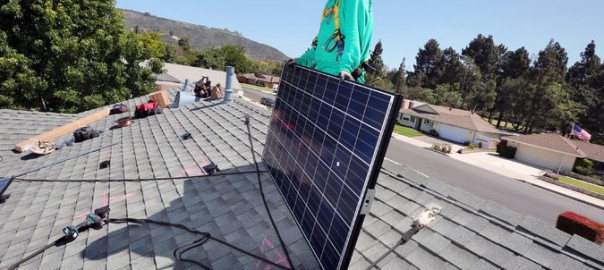 A solar panel being installed at a home in Camarillo, Calif. The state aims to get 50 percent of its energy from renewable sources by 2030. (Image: J.E. Flores/NYT)