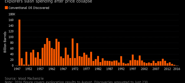 With oil prices down by more than half since the price collapse two years ago, drillers have cut their exploration budgets to the bone. The result: Just 2.7 billion barrels of new supply was discovered in 2015, the smallest amount since 1947, according to figures from Edinburgh-based consulting firm Wood Mackenzie Ltd. This year, drillers found just 736 million barrels of conventional crude as of the end of last month.